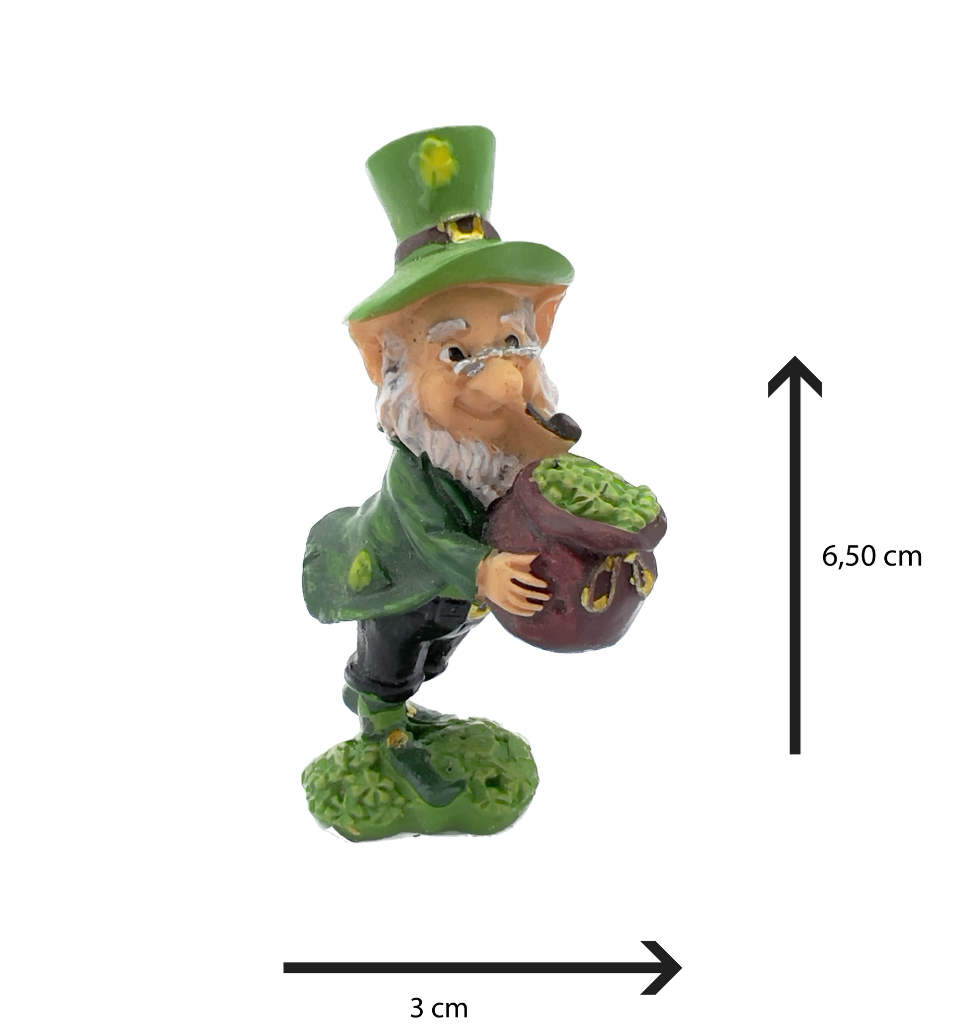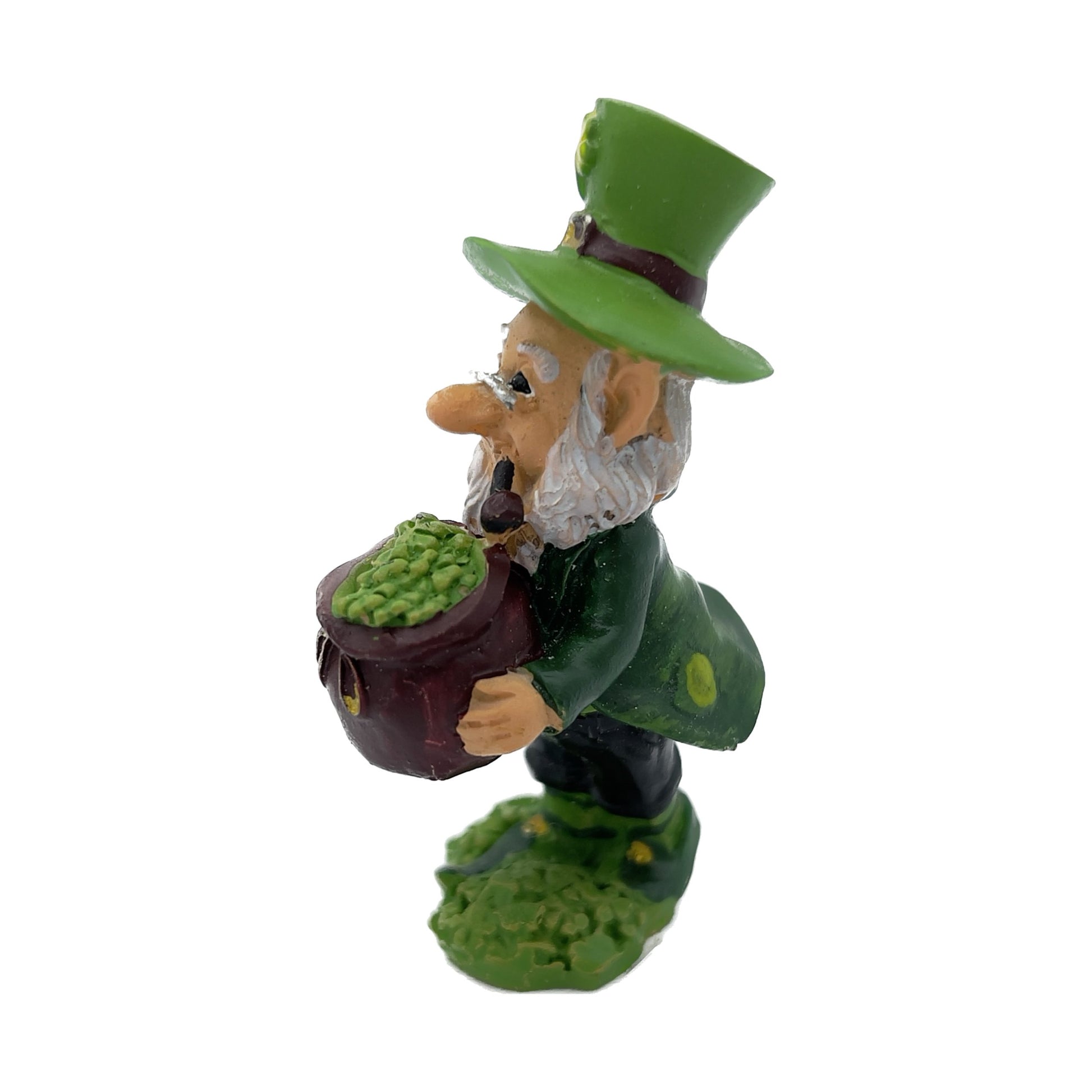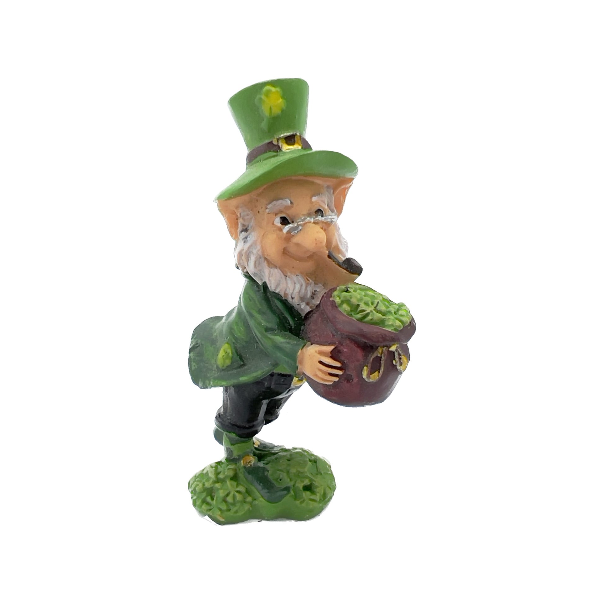 Bellissimo mini folletto di San Patrizio con pipa e sacco di quadrifogli