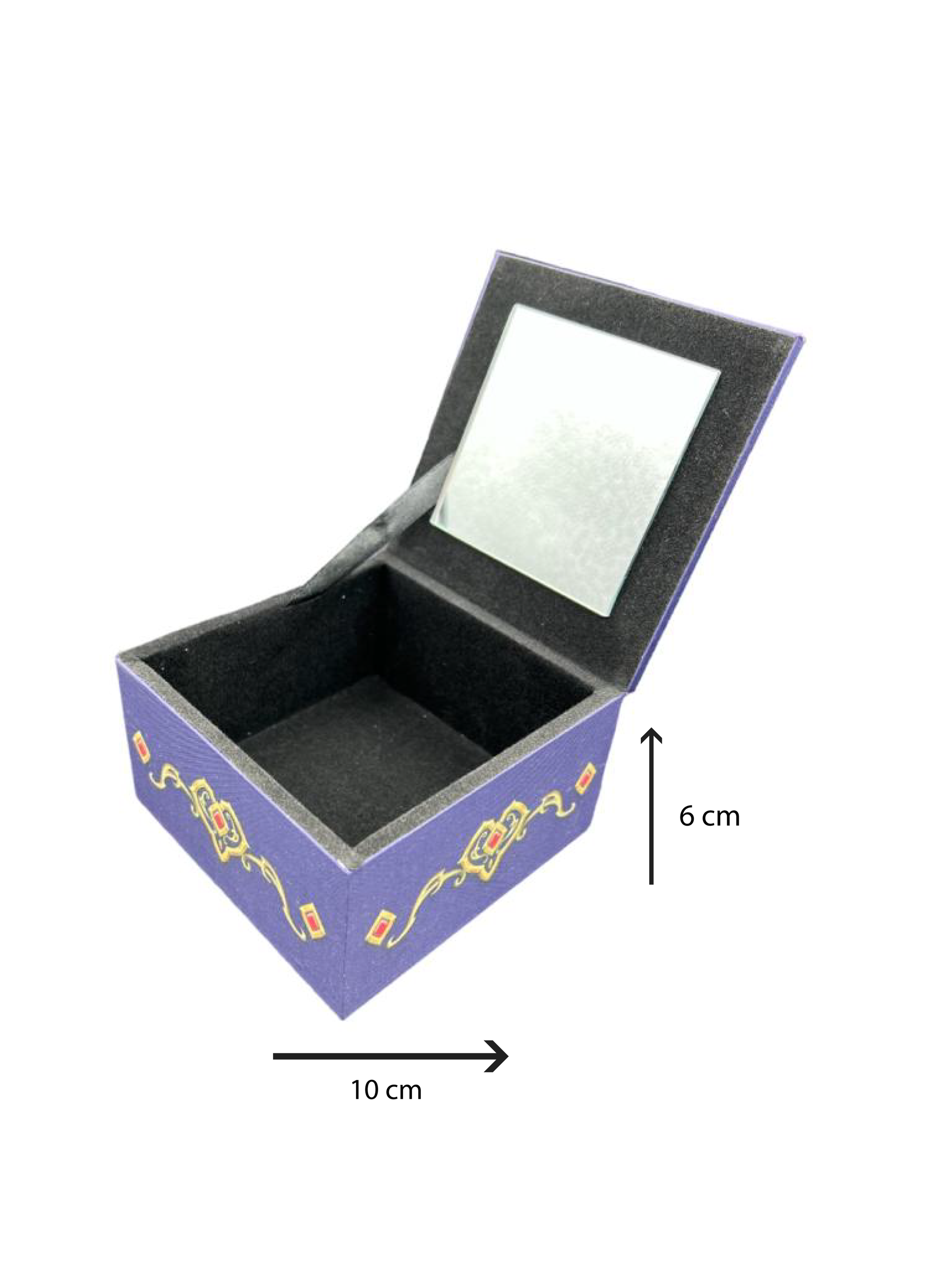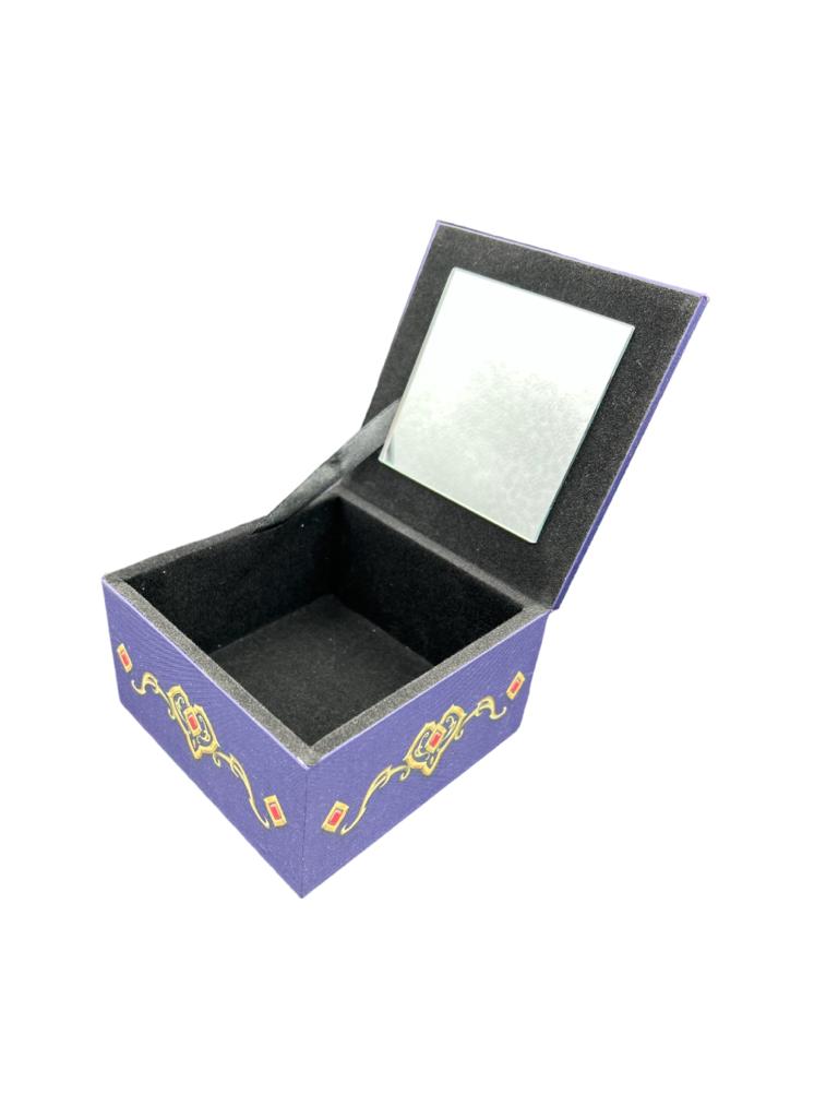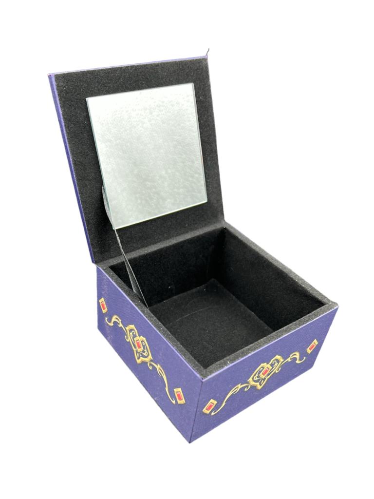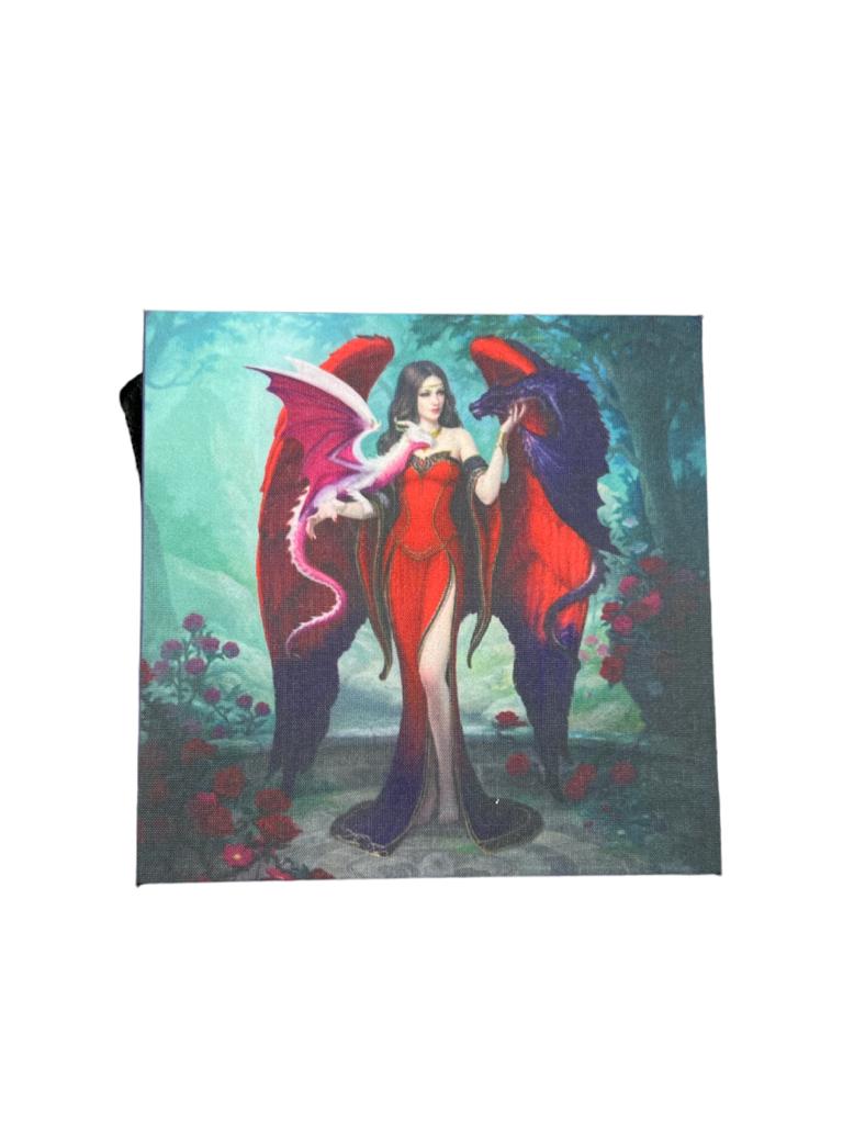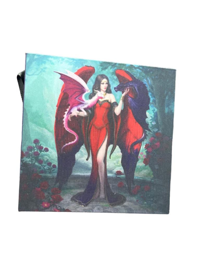 Bellissima scatola portagioie con specchietto ritraente fata in rosso accompagnata dal suo draghetto.