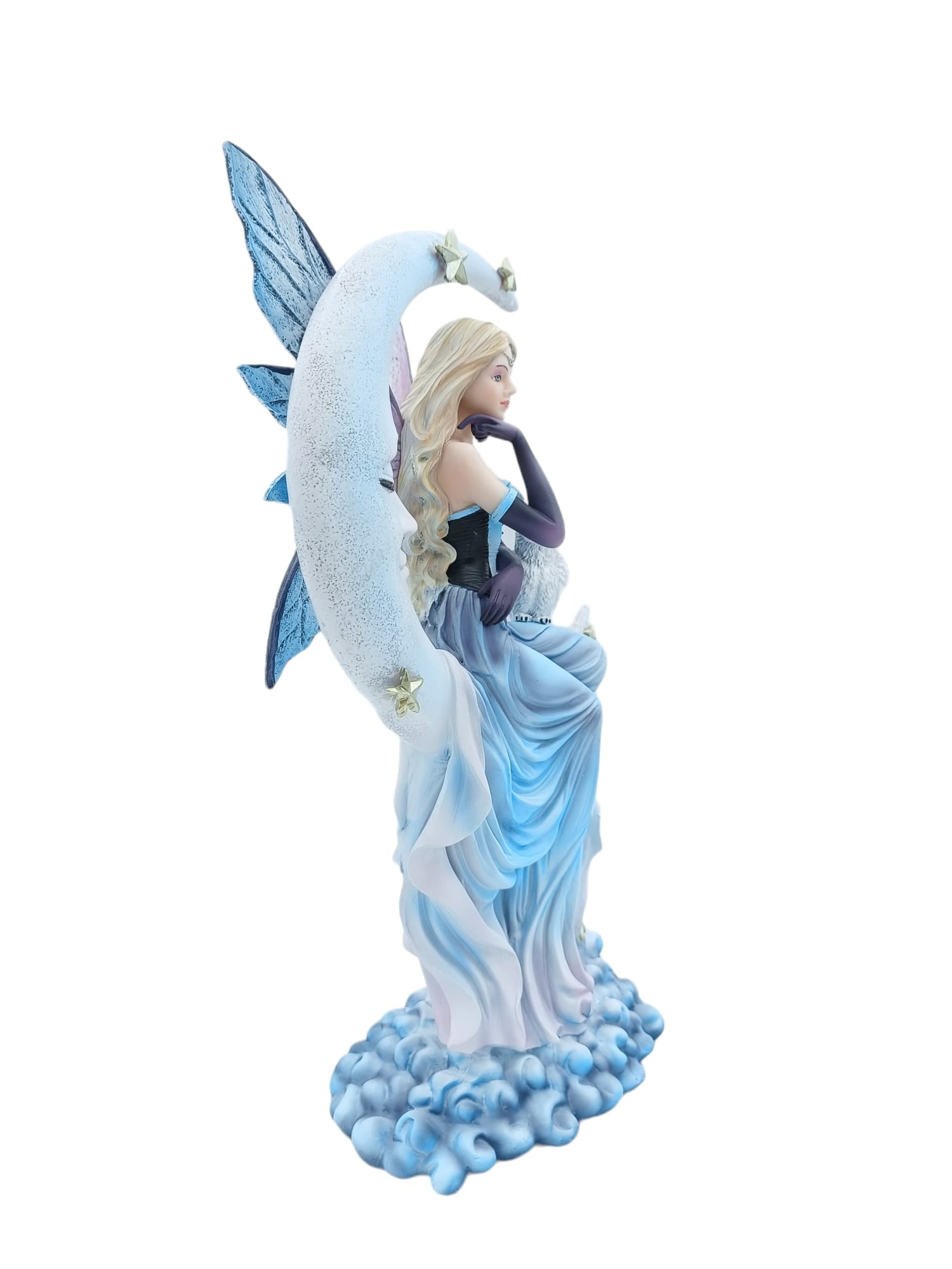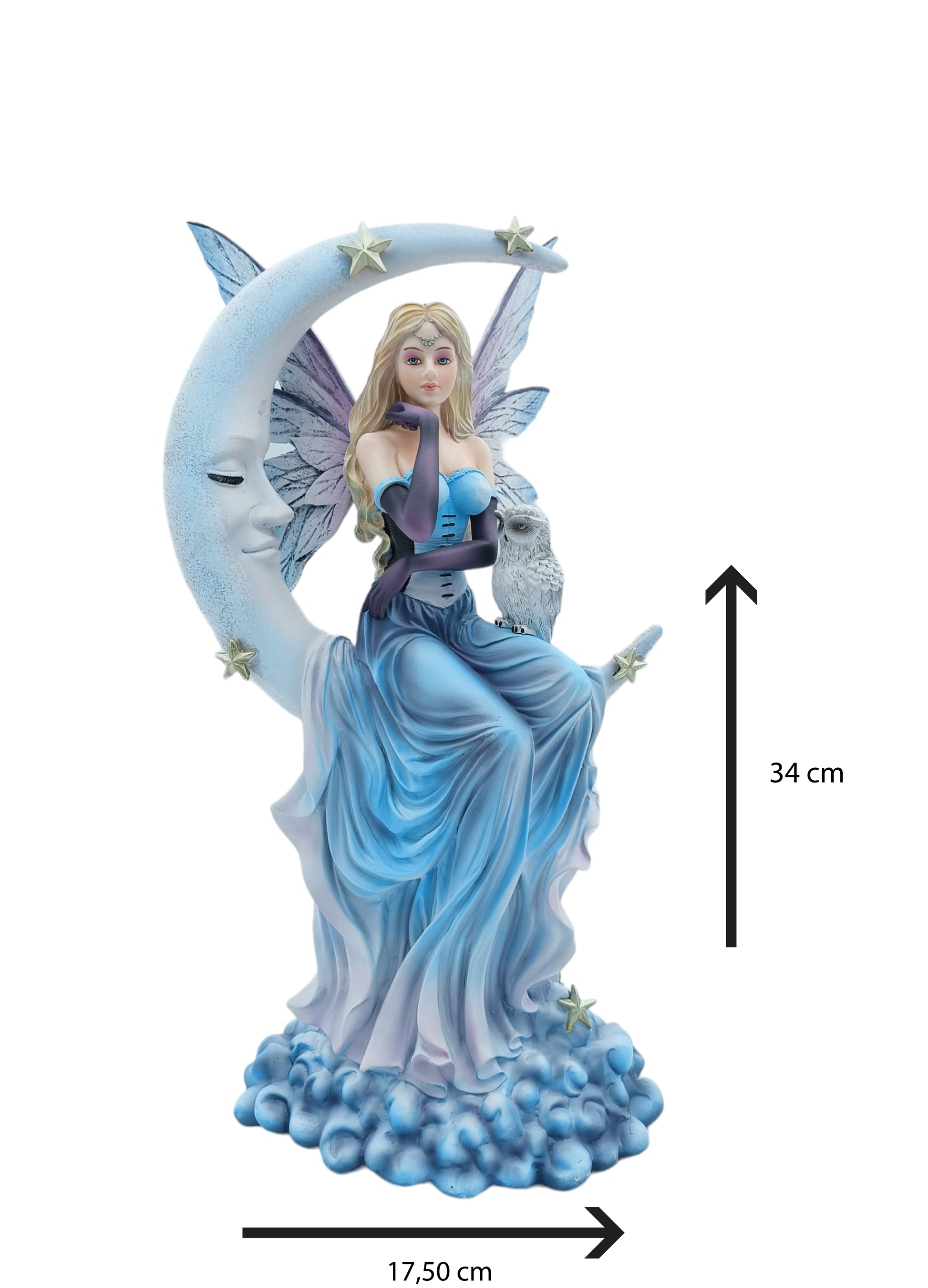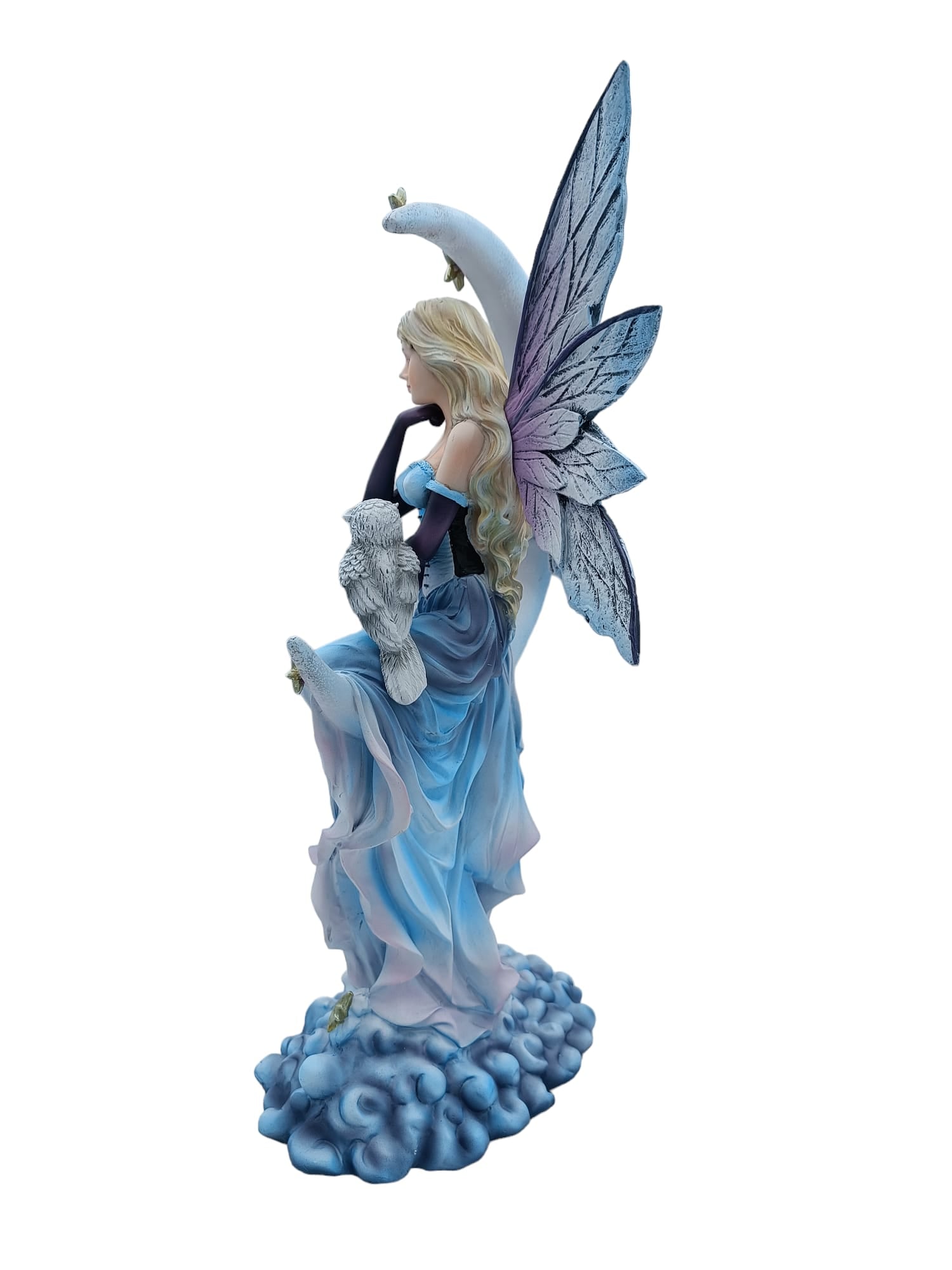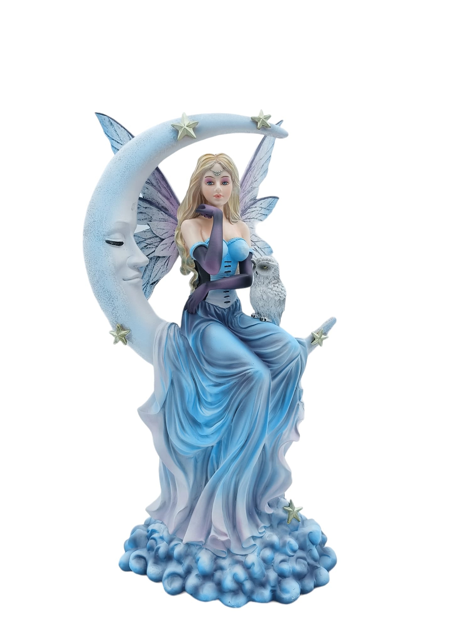 - Design unico: Fata seduta su una luna con un gufo bianco, colori accesi e tendenti all'azzurro (Nemesis Now)