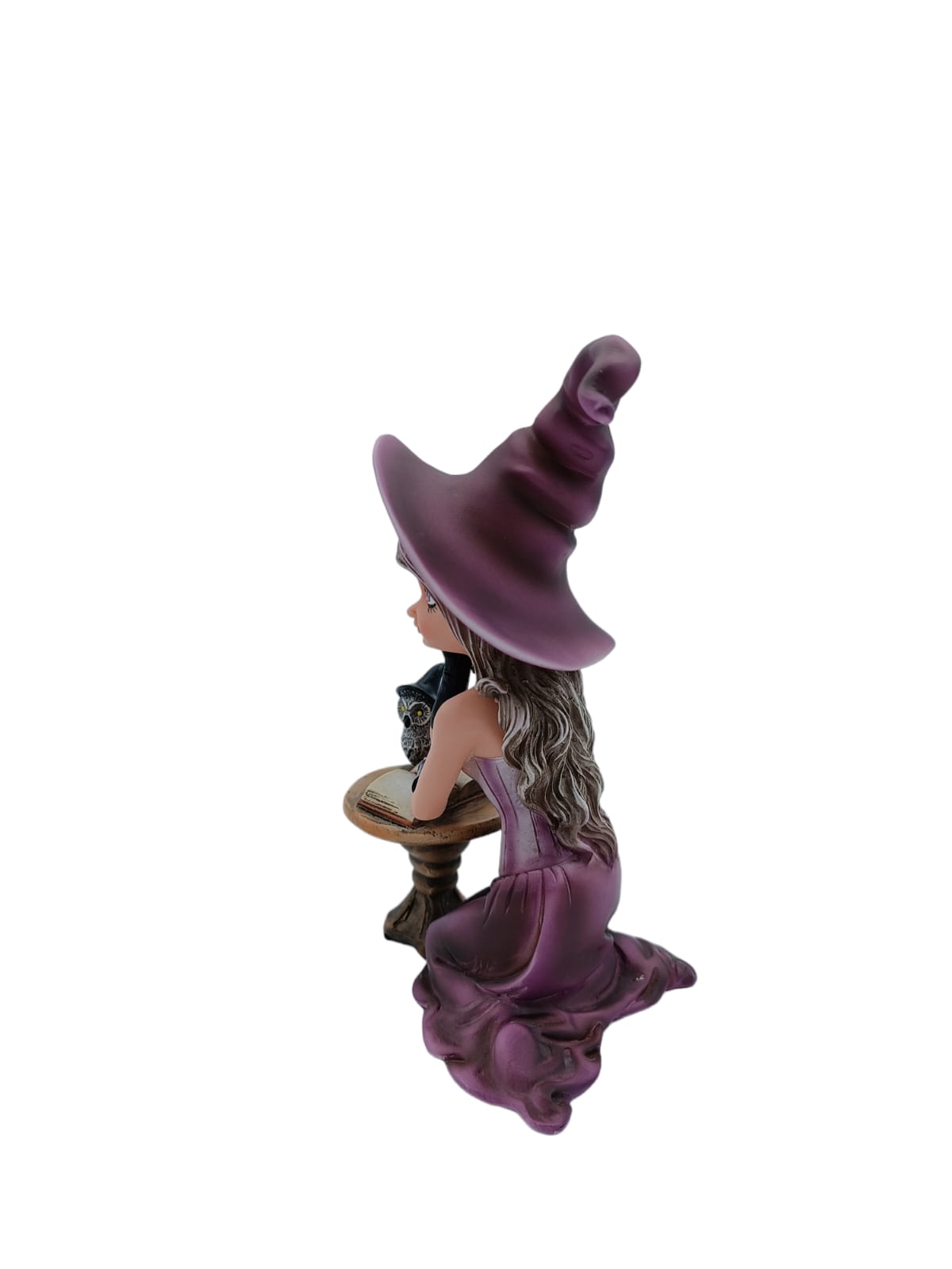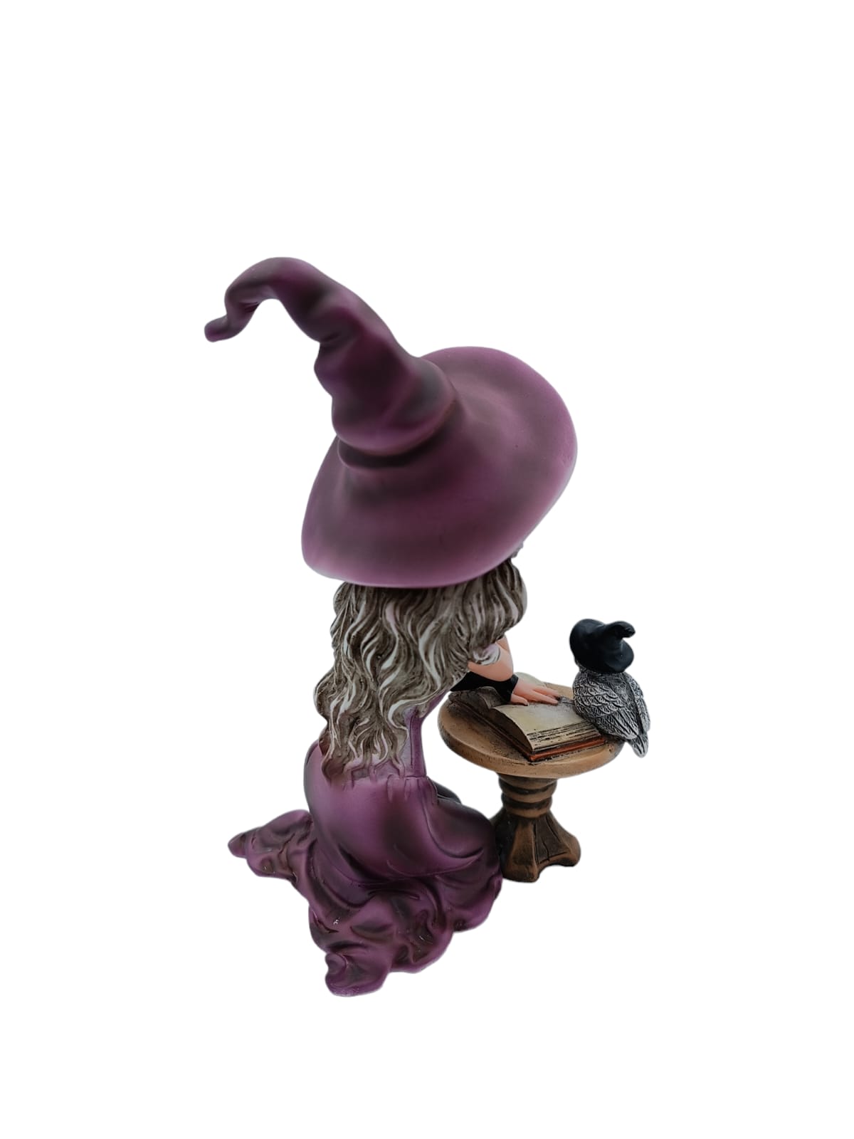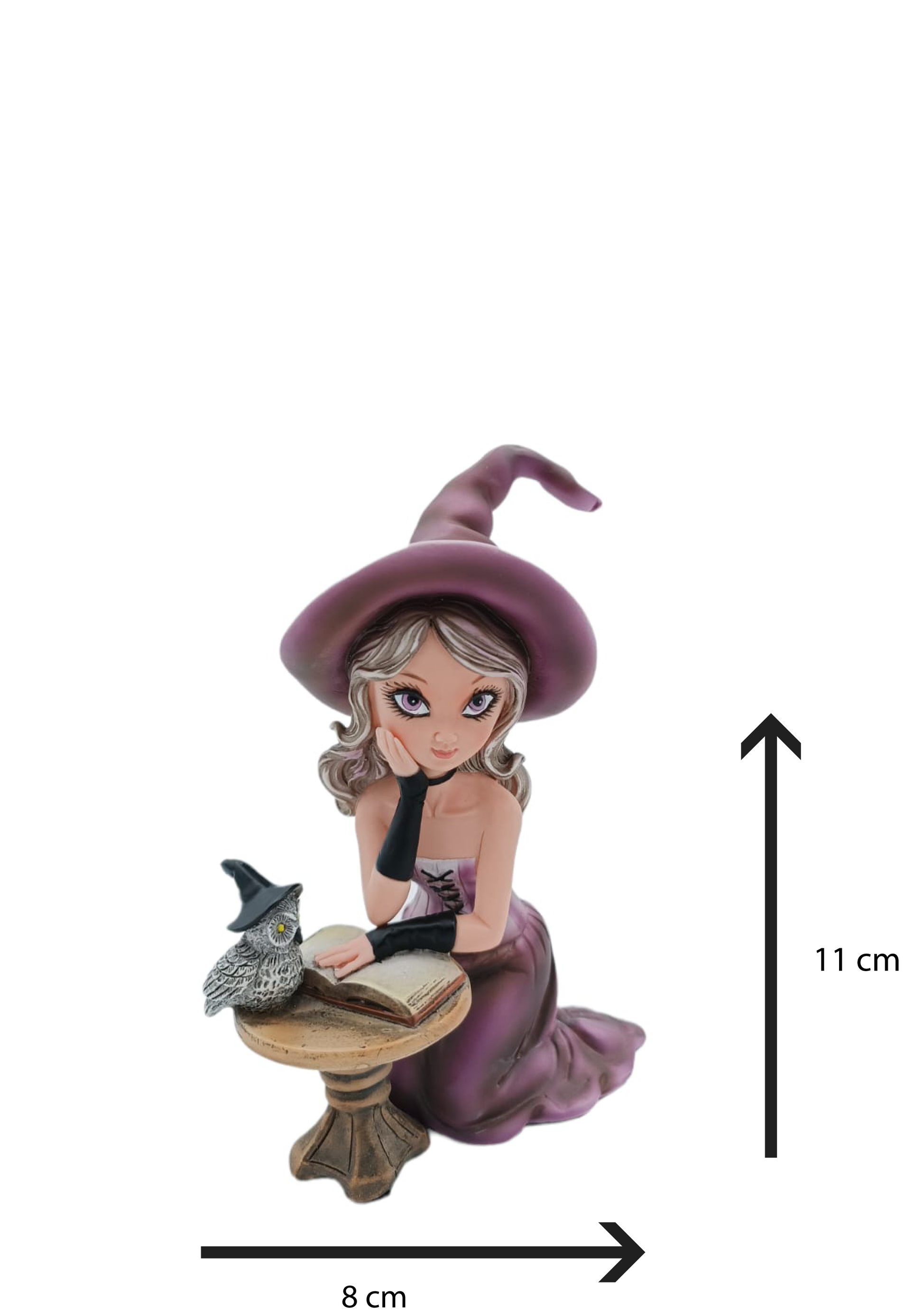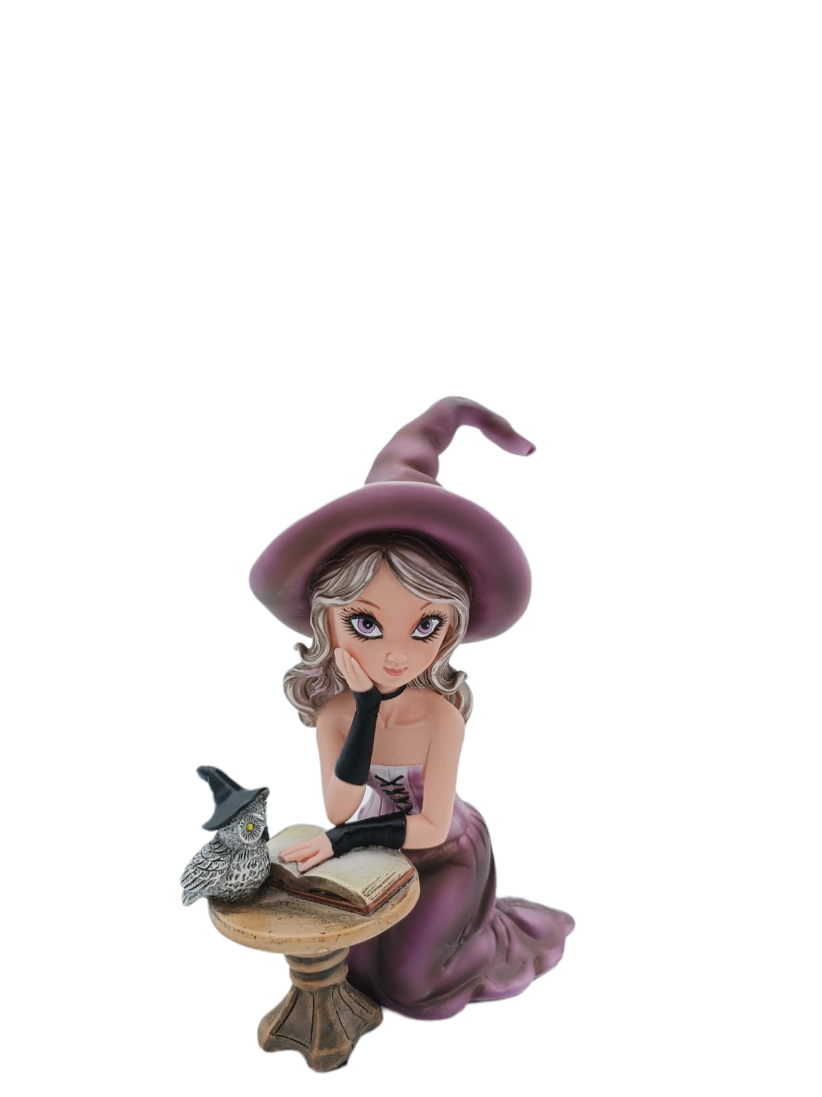 Questa bellissima statuina alta 15 cm raffigura una strega seduta con un libro di incantesimi sul tavolo e un gufo a far da guardiano. Nelle leggende medievali europee, i gufi erano spesso associati alle streghe e alle arti oscure. Si diceva che le streghe avessero gufi come famigli, spiriti animali che le aiutavano nei loro incantesimi e nelle loro magie. Questo ha portato a una connessione tra gufi e stregoneria nella cultura popolare.