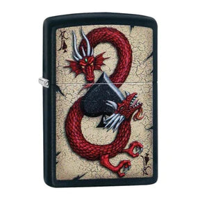 Questo classico accendino nero opaco presenta un asso di picche con un drago che serpeggia attraverso questo design, dandogli una sensazione pericolosa. Il design viene creato utilizzando stampe a colori. Viene confezionato in una scatola regalo. Per prestazioni ottimali, utilizzare il fluido di ricarica originale per accendini Zippo.