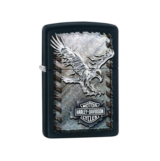 Questo accendino Harley-Davidson® nero opaco presenta la classica aquila Harley-Davidson® che si abbassa per afferrare il logo Harley-Davidson®. Viene confezionato in una scatola regalo. Per prestazioni ottimali, utilizzare il fluido di ricarica originale per accendini Zippo.